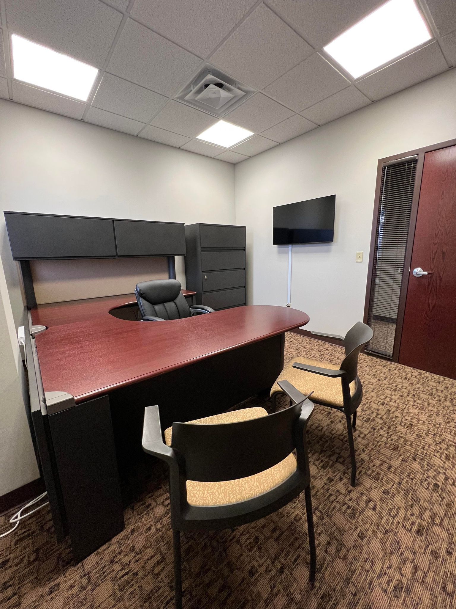 - Furnished with desk, 2 chairs, and large file cabinet
